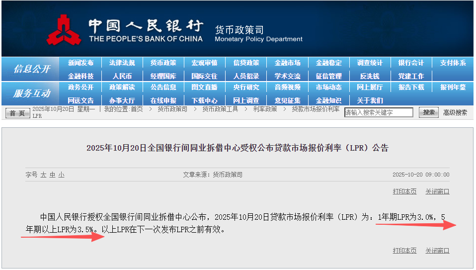 刚刚,央行公布10月LPR报价,最新5年期以上LPR为3.5%,1年期最新LPR为3.0%,均维持不变。